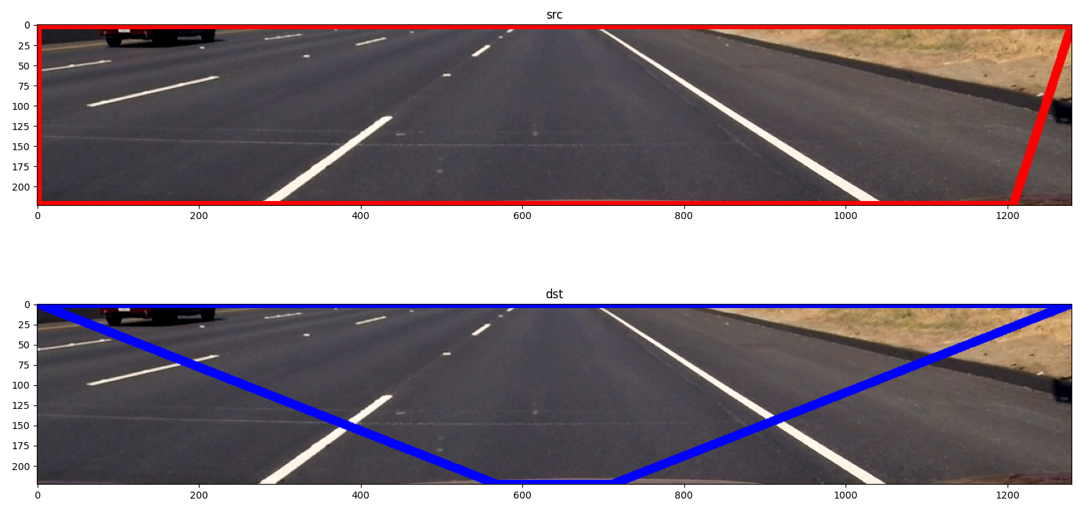 M = cv2.getPerspectiveTransform(src, dst) # The transformation matrix