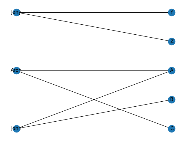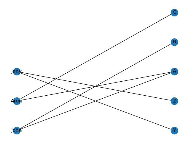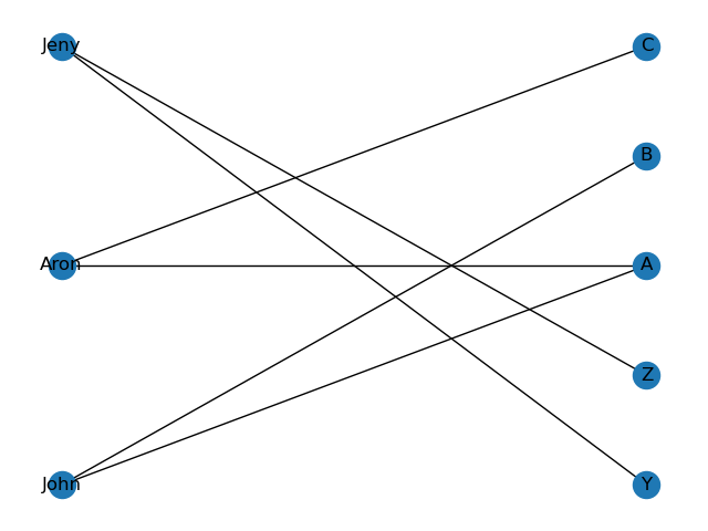 >>> nx.draw(G, pos=nx.bipartite_layout(G, people), with_labels=True)