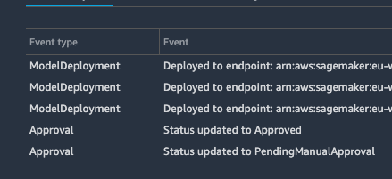 在默认的SageMaker管道项目模板中,您可以在为部署创建的CodePipeline管道中看到事件桥驱动的拟议逻辑:您可以在顶部看到“触发器- CloudWatchEvent”。您没有将事件源代码视为git中的代码,因为状态更改预计将在该演示模板中的Studio模型注册表UI中完成。