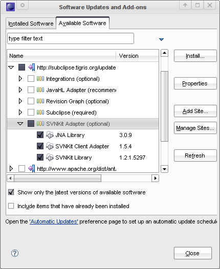 我正在Eclipse中安装Subcliish1.4.x,我想我应该使用SVNKit适配器。我使用的是Ubuntu8.04,它附带了SubVersion1.4.x,而且由于JavaHL适配器需要Subversion 1.5.x,所以使用像SVNKit这样的纯Java解决方案似乎是一个很好的解决方案。