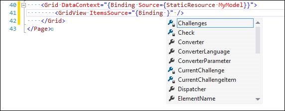 Visual 2010将支持绑定方面的intellisense。但是,这仅限于绑定对象本身的属性。例如,在XAML编辑器中键入"{Binding“之后,我将获得其余属性(Path、ElementName等)上的intellisense。