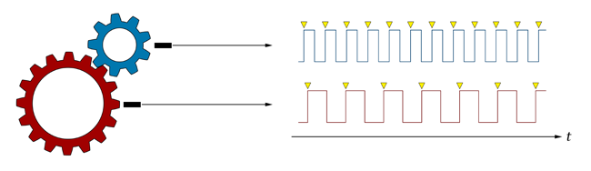 正如詹姆所指出的,这个图表中的信号实际上有相同的频率。真正的硬件在两个目标齿轮之间有几个更多的齿轮啮合阶段,其中一些是由轴而不是网状齿连接起来的,所以我最终得到了两个不同频率的方波,它们之间的比率仍然是恒定的。我想简化这张图,以得到问题的实质,但看起来我简化得太多了!