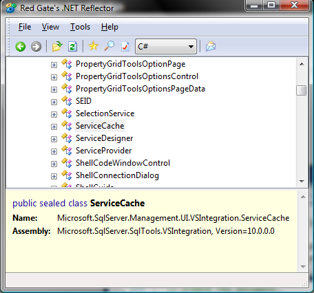 但奇怪的是。Microsoft.SqlServer.SqlTools.VSIntegration.dll包含一个名称空间Microsoft.SqlServer.Management.UI.VSIntegration,该名称空间又包含ServiceCache (公共密封)。