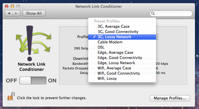 狮子:/Developer/Applications/Utilities/Network Link Conditioner