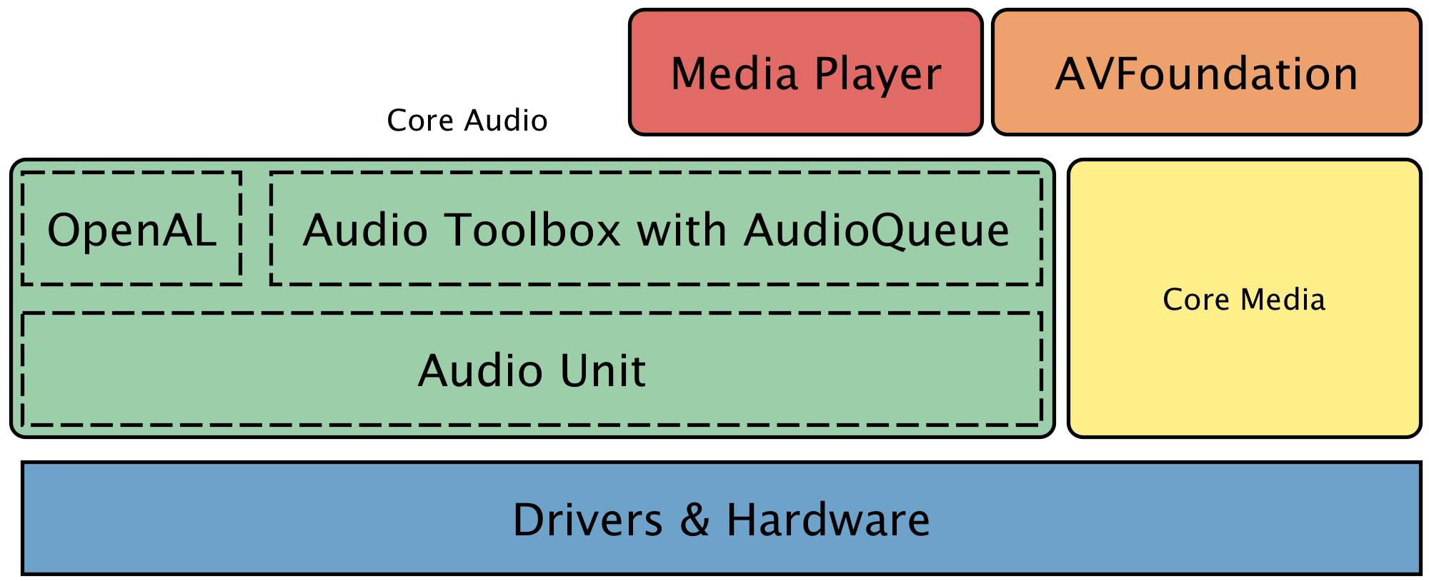 最接近硬件的框架是音频单元。在此基础上,有OpenAL和AudioToolbox与AudioQueue。在上面,您可以找到媒体播放器和AVFoundation (音频和视频)框架。