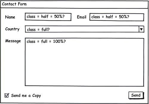 在图像中不太清楚,但是name (label) + name (input)应该占据容器宽度的50% (或接近),email label + input也是如此,而country (label) + country (select)应该占用100%的宽度。
