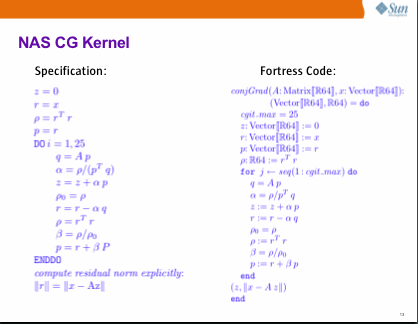 下面是从NAS (NASA高级超级计算)共轭梯度并行基准运行堡垒代码的实际示例。为了获得有趣的体验,请将基准测试的规范与堡垒中的实现进行比较,并注意如何实现1:1的通信。还比较几种其他语言(如C或Fortran )中的实现,并注意它们与规范完全无关(而且通常也比规范长一个数量级)。
