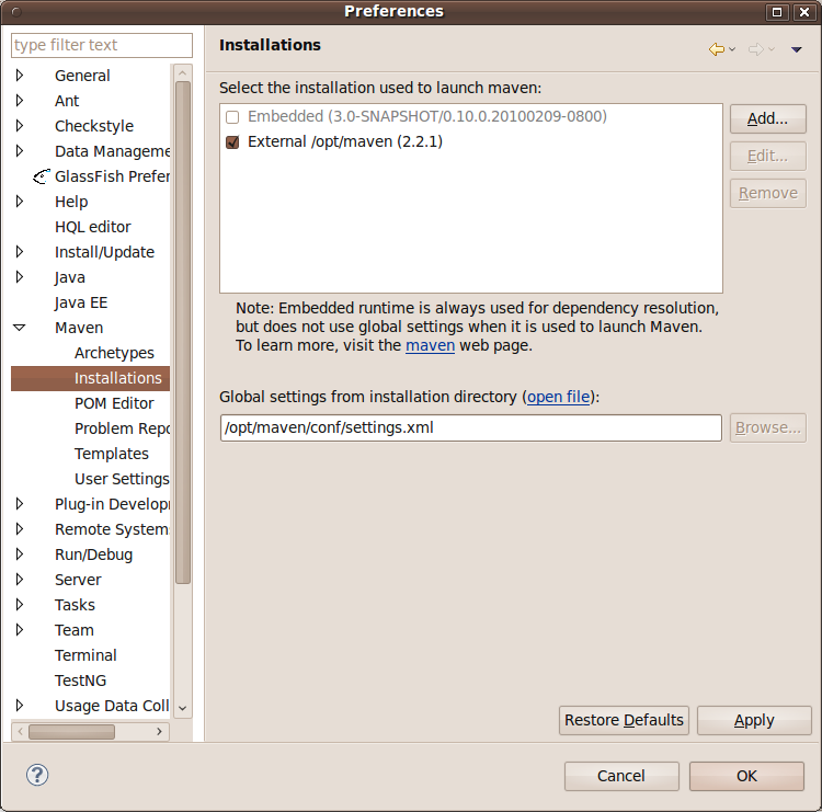 STS捆绑了M2Eclipse,它附带了一个嵌入版本的Maven (因此它不会“解包”Maven)。但是您可以将M2Eclipse配置为使用外部版本。转到窗口>首选项> Maven >和添加.您的外部安装: