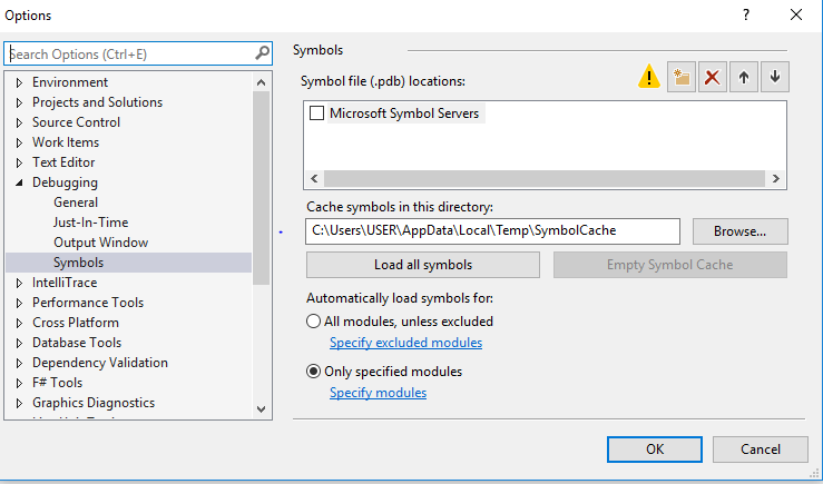 转到“工具”、“选项”、“调试”、“符号”,然后只选择指定的模块。