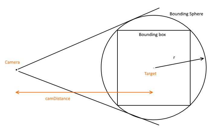 我知道上面有一些很好的答案,但我想加入一个简单的解决方案,以适应相机内的包围球。它假设要保持相机目标和前向矢量相同,并简单地调整相机距离以达到目标。