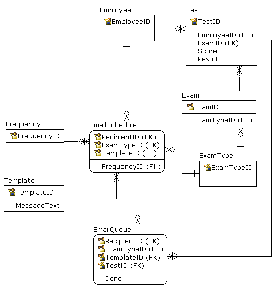 Test是Employee采取Exam的动作。员工可以参加几次考试。ExamType.Exam是接收电子邮件(Recipient)的特定人员,Recipient可以为每个ExamType在指定的Test.上安排(EmailSchedule)不同的电子邮件(Template)到EmailSchedule,每个Test.的电子邮件排在EmailQueue中。