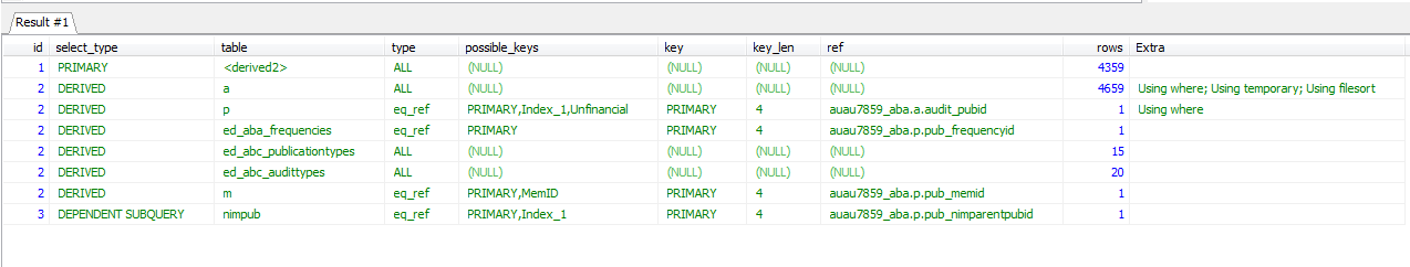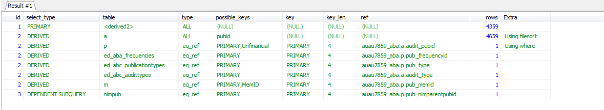 到目前为止谢谢你的回答。我已经为所有外键创建了索引,并在发布类型和audittype表中添加了一个主键(哎呀,这太愚蠢了)