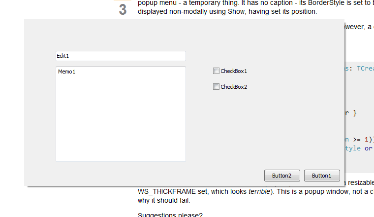 我制作了一个TForm导数,它的作用就像组合体的下拉部分、提示窗口或弹出菜单--这是暂时的事情。它没有标题-它的BorderStyle被设置为bsNone。在设置了窗体的位置后,将非模式地使用Show显示窗体。
