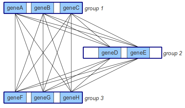 group 3: geneF geneG geneH对于每一对基因,geneX和geneY,我都有一个分数,说明这两个基因有多相似(实际上,我有两个分数,因为我使用了BLAST,它是“定向的”:我首先根据所有其他基因搜索geneX,然后针对所有其他基因搜索geneY,所以我有两个geneX--geneY分数,但我想我可以取两个较低的分数,也就是平均值)。