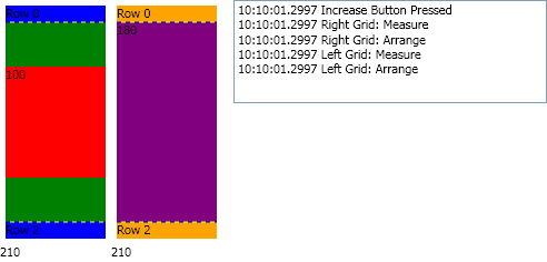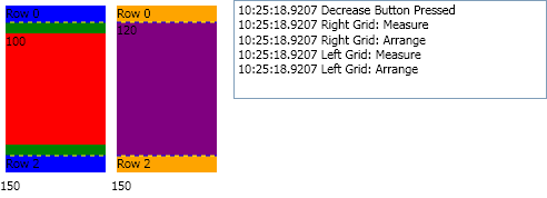 两个网格都有三行,每一行都包含一个TextBlock。中间一行是SharedSizeGroup。中间行的文本绑定到其ActualHeight的TextBlock,初始高度属性硬编码到您看到的值。网格下面的数字表示该网格的ActualHeight。注意,左边网格的BackgroundColor是绿色的。