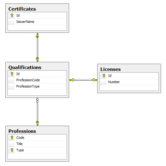 一种可能的解决方案是在职业中添加一个代理键,去掉资格中的Type,并将其替换为ProfessionId FK。这将消除冗余的担忧,但也会破坏TPH。实际上,歧视者从资格转移到职业。这里的问题是,我还没有找到映射许可证和证书对象的方法。也许我可以把地图换成视图?但我如何在代码中首先做到这一点呢?