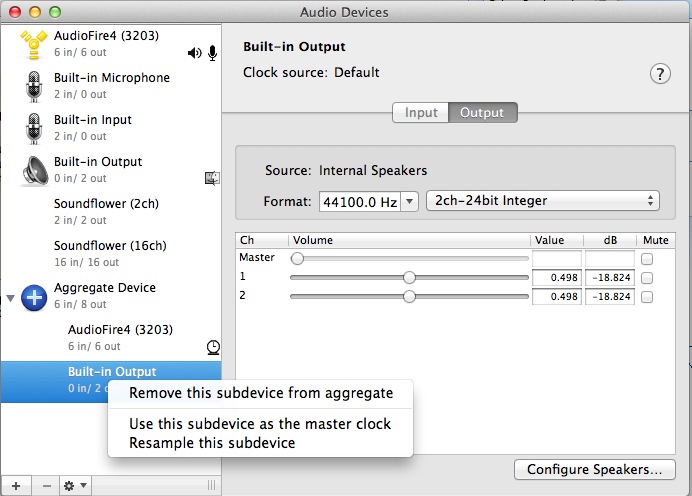 如果这仍然不起作用,那么您可以尝试将Mac内置音频添加到聚合设备中,并通过右键单击要成为主设备的设备使其成为主时钟。