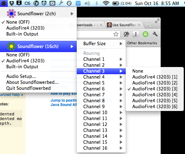 听起来好像你已经安装了声波花。Soundflowerbed与Soundflower在同一个磁盘映像中找到,是一个菜单栏应用程序。它允许您在没有内置用于选择声音设备的控件的应用程序之间路由声音。从磁盘映像中安装它并单击它以运行。