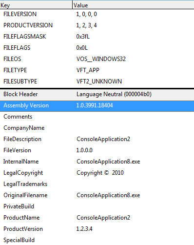 编译器确实会在资源中发出额外的字段。您可以在File + Open + File中看到它,选择程序集,打开版本节点,然后双击资源#1: