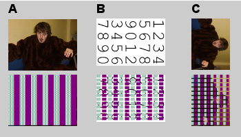 图像对A显示了测试图像(从facebook下载)的初步结果。图像对B显示应用于我的同事测试图像的相同操作;请注意,孵化区域在它们之间有空白。在GIMP中修改原始图像并重新保存后,第三个图像对显示相同的效果。(我最初这么做是为了看看定向是否有任何效果-没有。)