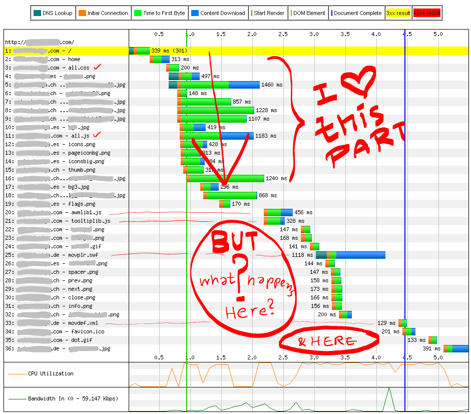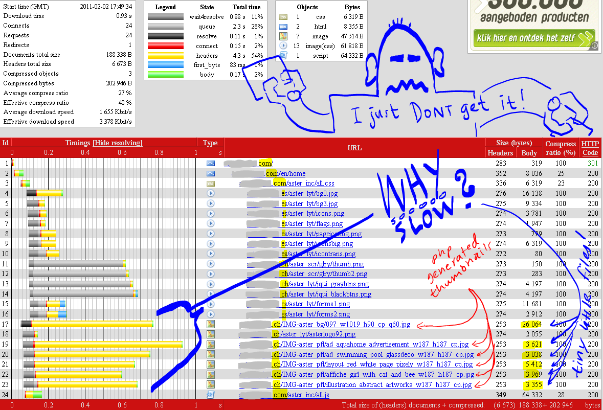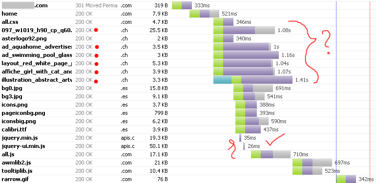 主要问题是如何使这个网站,加载更快。首先,我们需要阅读这些瀑布。感谢大家对瀑布读数分析的建议。从这里显示的各种瀑布图可以看出主要的瓶颈:PHP生成的缩略图。这个协议--从David建议的CDN加载的jquery --得到了我的赏赐,尽管我的站点总体上只快了3%,而且没有回答网站的主要瓶颈。是时候澄清我的问题了,还有另一个赏赐: