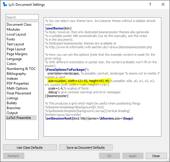 我发现poster-beamerposter.lyx很有用,因为我可以轻松地重新定义以下维度: