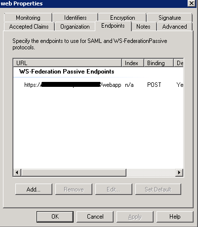 使用ADFS2.0管理单元在此依赖方上配置WS-Federation被动端点。“