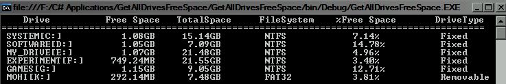 string s = " Drive Free Space TotalSpace FileSystem %Free Space DriveType\n\r========================================================================================\n\r";