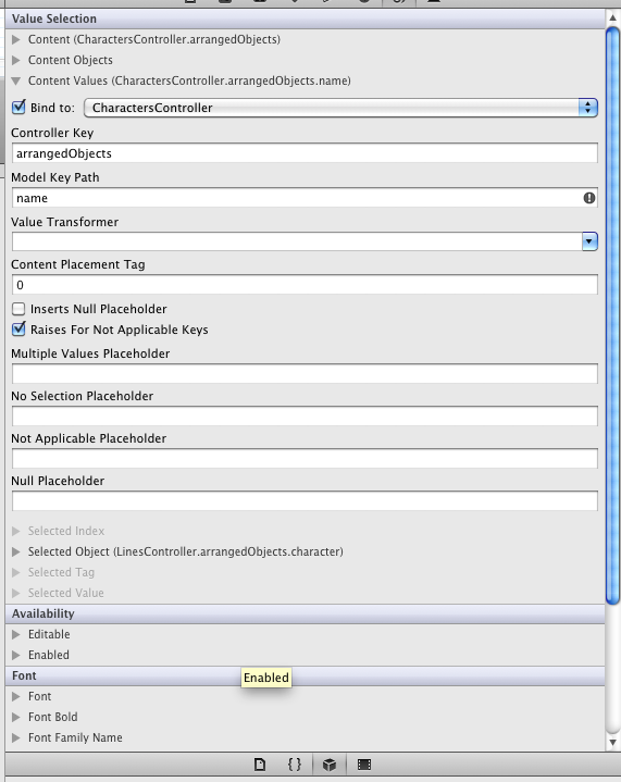 content列绑定到CharactersController.arrangedObjects,将selectedObject绑定到LinesController.arrangedObjects.character,则绑定工作(当我从弹出窗口中选择一个值时,它用新字符更新底层line对象),但列表显示<Character ...>条目。contentValues绑定到CharactersController.arrangedObjects.name,则在运行该应用程序时会得到以下调试错误: