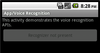 更新2:我遵循迈克尔的修正,安装了谷歌语音搜索应用程序。这解决了“识别器不存在”的问题,但现在我遇到了一个新的问题: