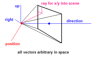 编辑:答案假设direction_vec是规范化的,这是应该的。right_vec在图片中(似乎左边应该在哪里),但right_vec并不是必需的,如果包括right_vec,则应该始终与-(up_vec x direction_vec)的方向相同。此外,这幅图暗示,x-coord随着你的正确而增加,y-coord随着你的下降而增加。这些迹象略有改变,以反映这一点。变焦可以通过将方程中的x项和y项相乘来执行,或者更有效地乘以向量并使用scaled_up_vec和scaled_right_vec。然而,变焦是等价的(因为光圈并不重要;这是一个完美的针孔相机)改变视场(FoV),这是一个比任意“缩放”更好的处理数量。有关如何实现FoV的信息,请参阅下面的评论。