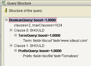 使用Occur.MUST相当于在标准查询解析器中使用+操作符。因此,代码计算的是+docurl:www.siteurl.com +docfile:Tomatoes*,而不是输入到路克中的表达式。要获得这种行为,在添加子句时尝试Occur.SHOULD。