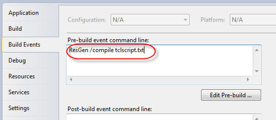 在构建项目之前,我需要运行ResGen。在“项目属性”对话框中,我设置了ResGen,但进入了错误Error 524 The command "ResGen /compile tclscript.txt" exited with code 9009.。