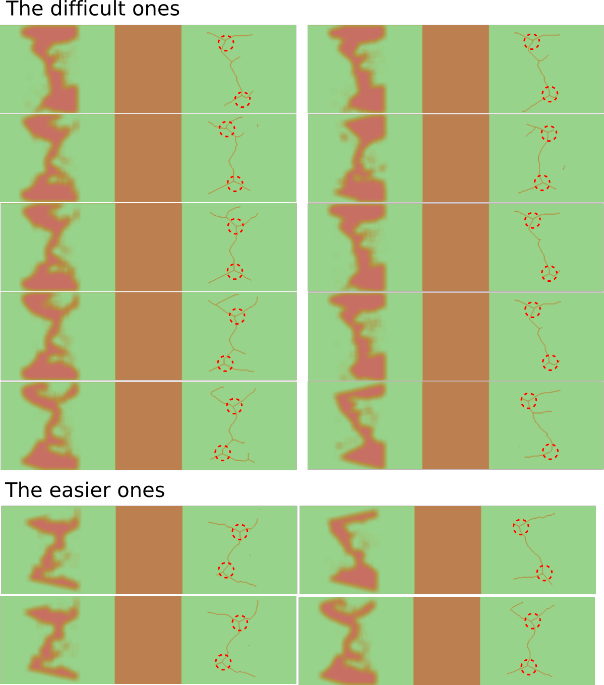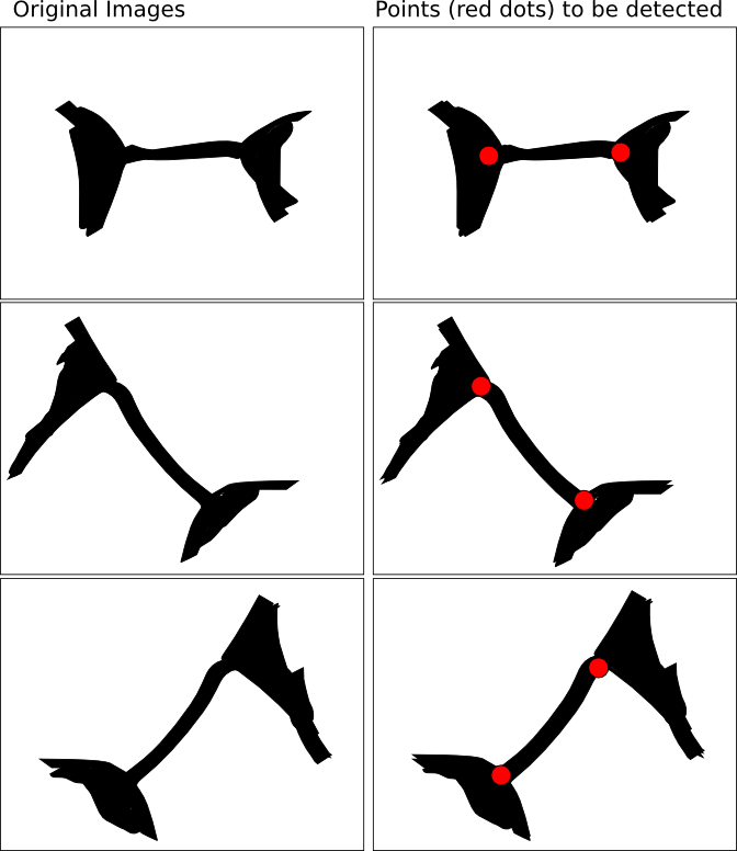 我有一组图片,看起来像你在左边的列上看到的,如上面的图片所示。我试图检测/定位的实际上是上面图片中右边列上显示的两个端点。这就像“桥”的“两头”定位一样。