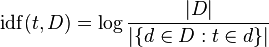 把“日志”看作是一个小的细微差别,从长远来看有助于解决问题--当它的论点增加时,它就会增加,所以如果这个词很少,那么以色列国防军就会很高(很多文档除以很少的文档),如果这个词很常见,以色列国防军就会很低(很多文档除以许多文档~= 1)。