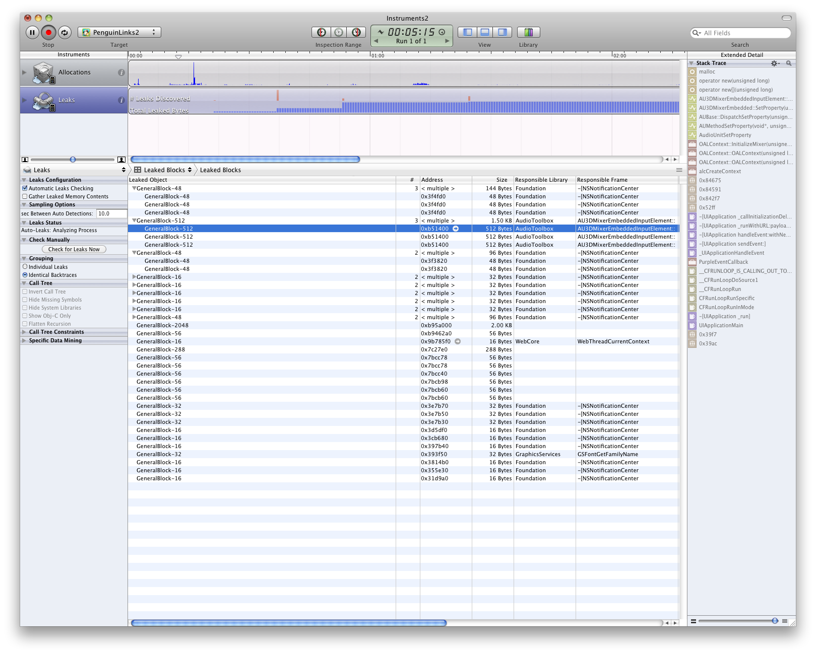 我已经检查了所有内存泄漏检测/清理过程,Xcode工具除了系统库(见下面的屏幕截图)外,没有泄漏。我也很少使用“自动发布”。