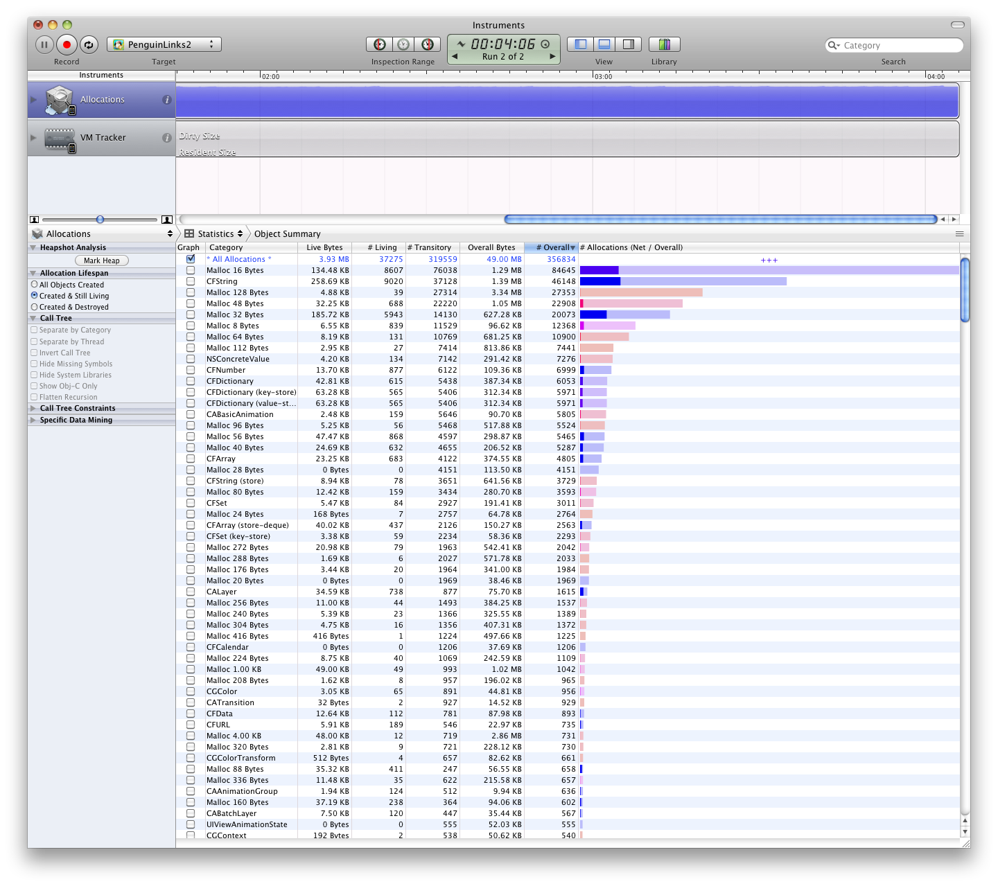 我还使用"CPU采样器“和”分配“对我的应用程序进行了描述,但对结果有点困惑。这是“分配”基准的结果: