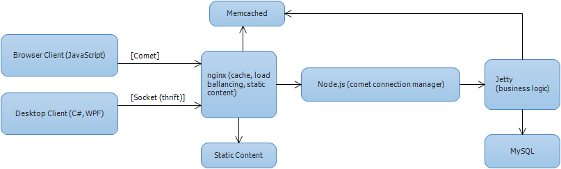 我正试图为我们的服务器设计一个良好的可伸缩架构,但经过几天的搜索和阅读维基百科后,我感到被如此大量的信息淹没了。服务器需要很简单,因为它不包含任何表示代码,但是它必须非常快,因为如果服务变得流行,我期待高流量。目前,我已经选择了我将要使用的大多数技术。以下是我的服务器架构版本: