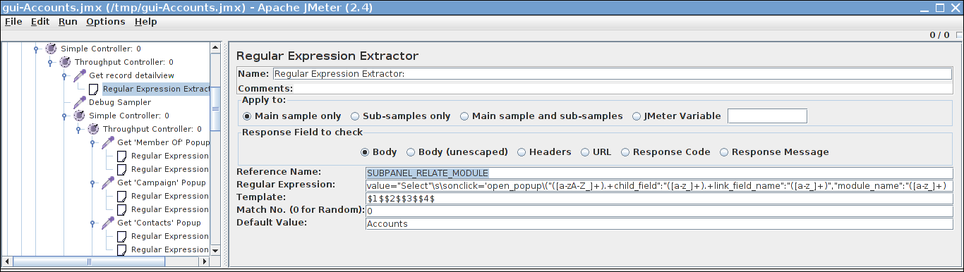 看起来您的regex在创建多个组时设置错误。如果您查看调试采样器,您有SUBPANEL_RELATE_MODULE=Accounts,但没有SUBPANEL_RELATE_MODULE_g1=。这意味着您没有组设置。