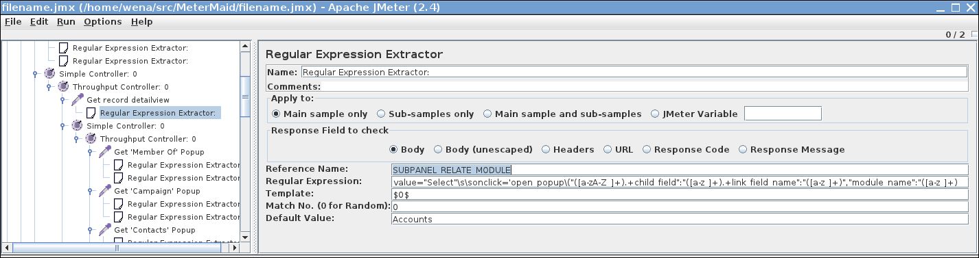 在正则表达式抽取器定义${SUBPANEL_RELATE_MODULE_g1}变量之后,在整个脚本中明智地使用它。确认它的存在。在Controller标题、测试标题、测试开始和测试结束时使用它。