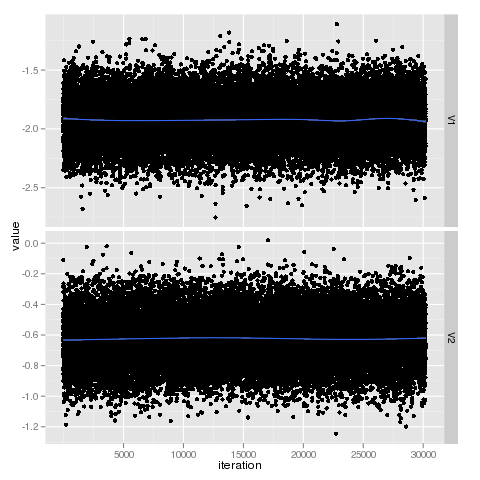myMelt <- melt( draws, id.var = "iteration" );这样我就可以制作一个多面的情节: