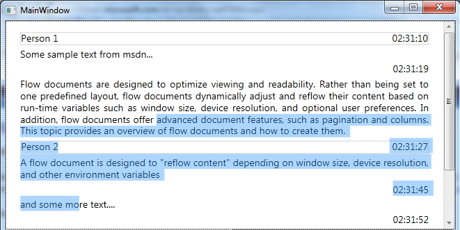 但是,由于您添加了支持跨多个消息进行选择的功能,因此,据我所知,这基本上排除了ItemsControl及其派生的类。您将不得不使用类似于FlowDocument的东西。