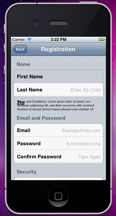 Note:这个问题是,而不是因为按钮的或屏幕底部的uitextView。如果我没有它们,而且我只有前三个部分,那么textFields就会被移动,它会扰乱几个单元格的textFields。还请注意与其他图像相比,图像4中的textField移动。代码粘贴在这里,http://www.pastie.org/2203340