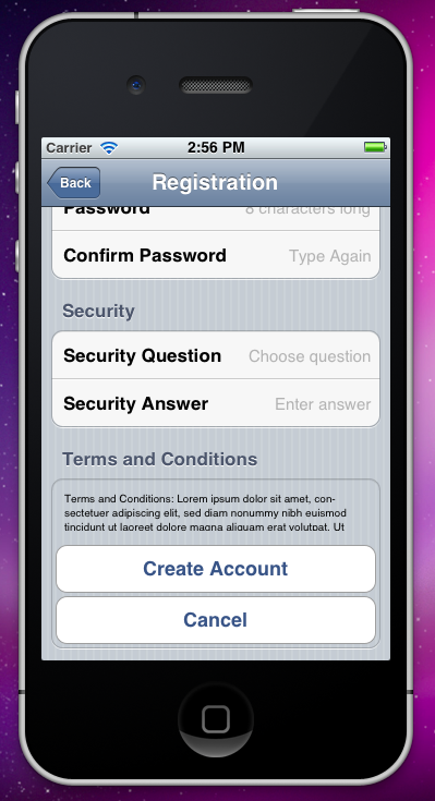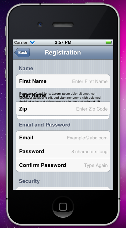 您在-reuseTableViewCellWithIdentifier:withIndexPath:方法中做了大量工作,最终导致单元格不能很好地重用。相反,您应该标识单元格的每个不同的“类型”或“样式”,这些单元格要独立于它们中显示的特定信息显示。例如,前三节中的所有单元似乎都是相同的:它们都类似于UITableViewCellStyleValue1标准单元格样式,只是细节标签左为空,右侧添加了一个文本字段。然后,对所有这些单元使用相同的重用标识符。-reuseTableViewCellWithIdentifier:withIndexPath:真的不应该关心索引路径--它应该按照所提供的重用标识符来创建和返回所需样式的单元格。将设置这些单元格中字段的文本的工作留给-tableView:cellForRowAtIndexPath:方法。