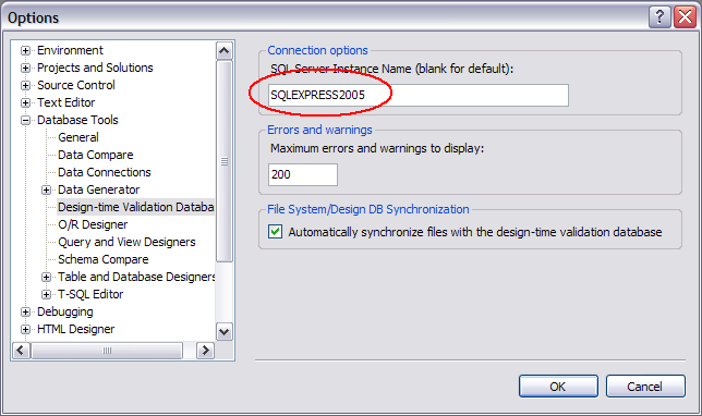 在“工具”>“选项”>“数据库工具”>“设计时验证数据库”下,有一个设置Server实例名称的选项。Visual在安装时会自动选择此选项。