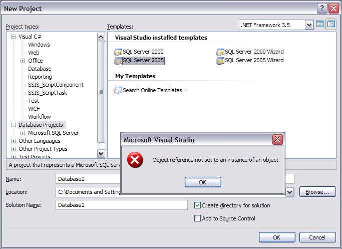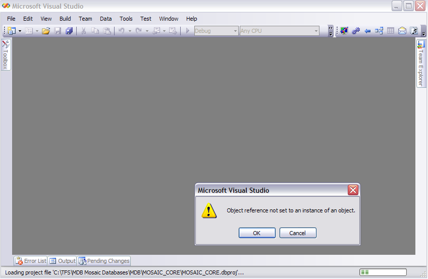 我有VisualStudio2008DatabaseEdition,在我第一次尝试加载.dbproj文件之前,一切都很顺利。这些数据库项目文件适用于与我一起工作的其他开发人员,但当我试图打开它时,我只会收到一条错误消息"Object reference to a object“。