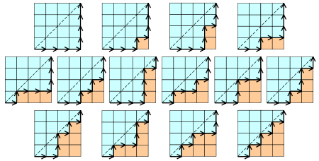 你必须从原点(0,0)到(n,n),假设v是垂直向上的1单位,h是水平向右的1单位。所有路径看起来都是这样的-- {vvvhhhvhhhvh.... , vvhhvvhhhvvv...,........)的v和h分布在v的数的长度+h的数上,这必须是