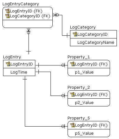 LogEntry与LogCategory有多到多的关系,LogEntry与LogEntryProperty有1比多的关系(这是名称/值对)。