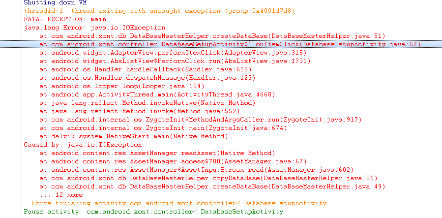 java.io.FileNotFoundException: /data/data/com.android.xont.controller/databases /MasterUserVentura_HEMA.db (No such file or directory)我已经更改了e.printStackTrace(),而不是抛出预期。