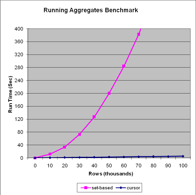 运行总计是典型的情况,随着行数的增加,游标可以执行基于集合的操作,因为尽管游标的固定成本较高,但是所需的工作量是线性增长的,而不是像基于集合的“三角连接”方法那样呈指数增长。